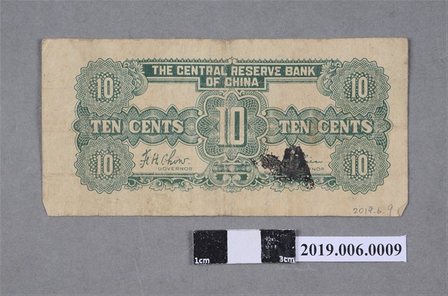 本文物為中央儲備銀行發行壹角紙鈔(民國32年版本)。民國26年12月13日日軍佔領南京,隔年12月汪精衛投降日軍,在南京成立中華民國國民政府並開設「中央儲備銀行」發行紙鈔。此為民國32年壹角版本,鈔票版面為綠色,正面圖像為南京中山陵及「此券拾張兌付國幣壹圓」字樣,背面印有「THE CENTRAL RESERVE BANK OF CHJNA」、「TEN CENTS」英文字樣及簽署字樣。