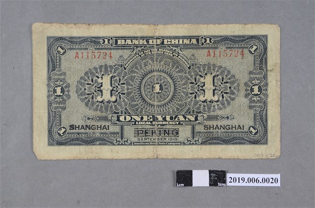 本文物為中國銀行發行壹圓紙鈔(民國7年版本)。中國銀行於民國1年2月5日成立,民國2年總行設於北京。此為民國7年壹圓版本,由美國鈔票公司印製,鈔票版面為藍色,正面印有「憑票即付國幣壹圓」及兩側「上海」字樣,背面印有「BANK OF CHINA」字樣。