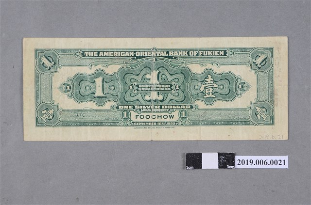 本文物為福建美豐銀行發行壹圓紙鈔(民國11年版本)。福建美豐銀行為上海美豐銀行在福建開設的分行。此為民國11年壹圓版本,由美國鈔票公司印製,鈔票版面為綠色,正面印有船隻出港圖像及「憑票兌付通用銀圓」字樣,背面則印有「THE AMERICAN-ORIENTAL BANK OF FUKIEN」、「ONE SILVER DOLLAR」字樣。