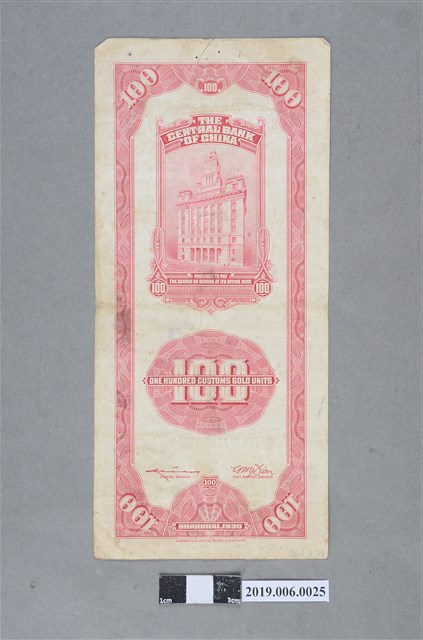 本文物為中央銀行發行關金壹百圓紙鈔(民國19年版本)。民國13年8月16日孫中山於廣州創立中央銀行,民國20年5月發行關金券,關金券全名為「海關金單位兌換券」,專為繳納關稅用途,財政部為維持償還外債和賠款的能力,特別制定的一種繳納關稅單位,民國30年為方便繳納關稅。不限使用關金,按1比20比例收受法幣。此為民國19年關金壹佰圓版本,由美國鈔票公司印製,鈔票版面為紅色直式,正面印有國父孫中山像及「上海」字樣,背面為上海海關大樓圖像及「THE CENTRAL BANK OF CHINA」、「ONE HUNDRED CUSTOMS GOLD UNITS」等字樣。