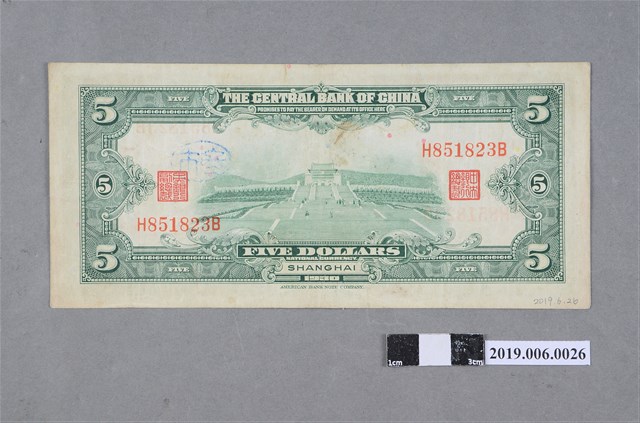 本文物為中央銀行發行伍圓紙鈔(民國19年版本)。民國13年8月16日孫中山於廣州創立中央銀行。此為民國19年伍圓版本,由美國鈔票公司印製,鈔票版面為綠色,正面印有國父孫中山像及「上海」字樣。