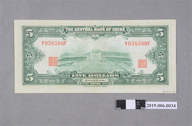 本文物為中央銀行發行伍圓紙鈔(民國19年版本)。民國13年8月16日孫中山於廣州創立中央銀行。此為民國19年伍圓版本,由美國鈔票公司印製,鈔票版面為綠色,正面印有國父孫中山像及「上海」字樣。
