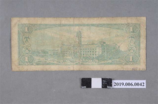 本文物為臺灣銀行發行壹圓紙鈔(民國50年版)。民國38年6月15日臺灣省政府實行幣制改革,公布「新臺幣發行辦法」,發行「新臺幣」(改制前為舊臺幣),舊臺幣肆萬圓兌換新臺幣壹圓,民國38~49年發行之新臺幣版面為直式,民國50年為橫式。民國50年5月1日開始印製新版橫式紙鈔,除保留紙幣圖案保留國父像,更添加臺灣各地風景圖,而原本的「臺灣銀行總行」則改為「中華民國總統府」。此為民國50年壹圓版本,由臺灣銀行印刷所印製,紙鈔版面顏色正面為灰色,反面為綠色,正面為孫中山國父像及蘇花公路風景圖像,背面圖案為中華民國總統府。