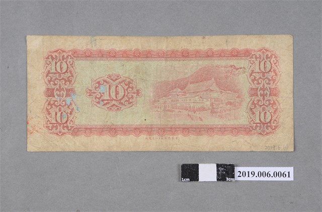 本文物為臺灣銀行發行拾圓紙鈔(民國58年版)。民國38年6月15日臺灣省政府實行幣制改革,公布「新臺幣發行辦法」,發行「新臺幣」(改制前為舊臺幣),舊臺幣肆萬圓兌換新臺幣壹圓,民國38~49年發行之新臺幣版面為直式,民國50年為橫式,民國50年5月1日開始印製新版橫式紙鈔。此為民國58年拾圓版本,由中央印製廠印製,紙鈔版面顏色為紅色,正面為孫中山國父像,背面圖案為陽明山中山樓。