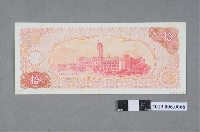 本文物為臺灣銀行發行拾圓紙鈔(民國65年版)。民國38年6月15日臺灣省政府實行幣制改革,公布「新臺幣發行辦法」,發行「新臺幣」(改制前為舊臺幣),舊臺幣肆萬圓兌換新臺幣壹圓,民國38~49年發行之新臺幣版面為直式,民國50年為橫式,民國50年5月1日開始印製新版橫式紙鈔。此為民國65年拾圓版本,由中央印製廠印製,紙鈔版面顏色為紅色,正面為孫中山國父像,背面圖案為中華民國總統府。