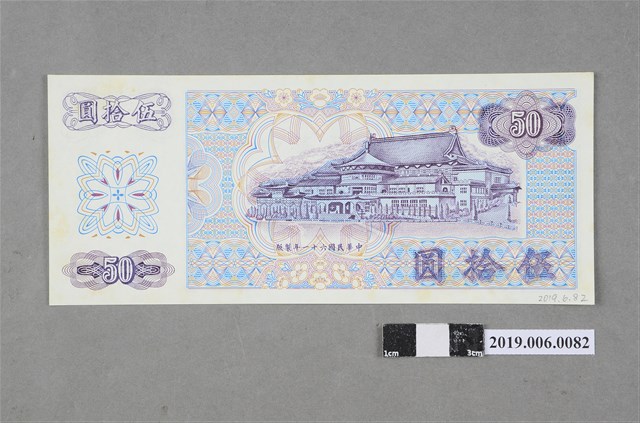 本文物為臺灣銀行發行伍拾圓紙鈔(民國61年版)。民國38年6月15日臺灣省政府實行幣制改革,公布「新臺幣發行辦法」,發行「新臺幣」(改制前為舊臺幣),舊臺幣肆萬圓兌換新臺幣壹圓,民國38~49年發行之新臺幣版面為直式,民國50年為橫式,民國50年5月1日開始印製新版橫式紙鈔。此為民國61年伍拾圓版本,由中央印製廠印製,紙鈔版面顏色為紫色,正面為孫中山國父像,背面圖案為陽明山中山樓。