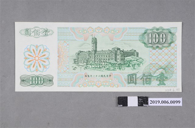 本文物為臺灣銀行發行壹佰圓紙鈔(民國61年版)。民國38年6月15日臺灣省政府實行幣制改革,公布「新臺幣發行辦法」,發行「新臺幣」(改制前為舊臺幣),舊臺幣肆萬圓兌換新臺幣壹圓,民國38~49年發行之新臺幣版面為直式,民國50年為橫式,民國50年5月1日開始印製新版橫式紙鈔。此為民國61年壹佰圓版本,由中央印製廠印製,紙鈔版面顏色為綠色,正面為孫中山國父像,背面圖案為中華民國總統府。