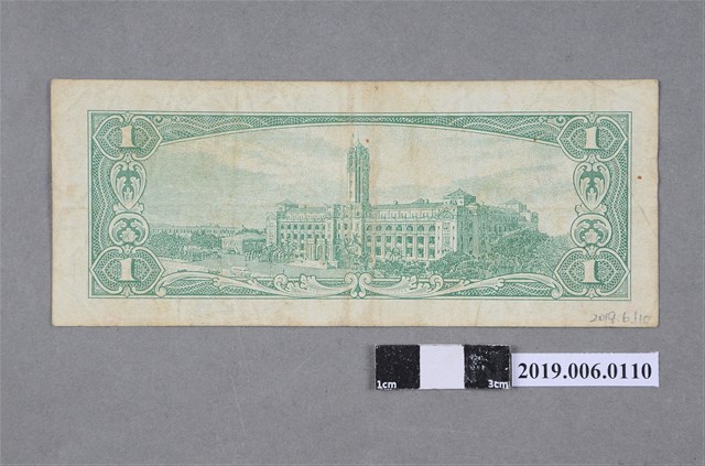 本文物為臺灣銀行發行壹圓紙鈔(民國50年版)。民國38年6月15日臺灣省政府實行幣制改革,公布「新臺幣發行辦法」,發行「新臺幣」(改制前為舊臺幣),舊臺幣肆萬圓兌換新臺幣壹圓,民國38~49年發行之新臺幣版面為直式,民國50年為橫式。民國50年5月1日開始印製新版橫式紙鈔,除保留紙幣圖案保留國父像,更添加臺灣各地風景圖,而原本的「臺灣銀行總行」則改為「中華民國總統府」。此為民國50年壹圓版本,由臺灣銀行印刷所印製,紙鈔版面顏色正面為灰色,反面為綠色,正面為孫中山國父像及蘇花公路風景圖像,背面圖案為中華民國總統府。