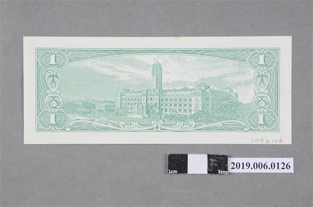 本文物為臺灣銀行發行壹圓紙鈔(民國50年版)。民國38年6月15日臺灣省政府實行幣制改革,公布「新臺幣發行辦法」,發行「新臺幣」(改制前為舊臺幣),舊臺幣肆萬圓兌換新臺幣壹圓,民國38~49年發行之新臺幣版面為直式,民國50年為橫式。民國50年5月1日開始印製新版橫式紙鈔,除保留紙幣圖案保留國父像,更添加臺灣各地風景圖,而原本的「臺灣銀行總行」則改為「中華民國總統府」。此為民國50年壹圓版本,由臺灣銀行印刷所印製,紙鈔版面顏色正面為灰色,反面為綠色,正面為孫中山國父像及蘇花公路風景圖像,背面圖案為中華民國總統府。