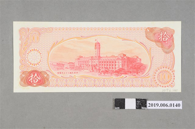 本文物為臺灣銀行發行拾圓紙鈔(民國65年版)。民國38年6月15日臺灣省政府實行幣制改革,公布「新臺幣發行辦法」,發行「新臺幣」(改制前為舊臺幣),舊臺幣肆萬圓兌換新臺幣壹圓,民國38~49年發行之新臺幣版面為直式,民國50年為橫式,民國50年5月1日開始印製新版橫式紙鈔。此為民國65年拾圓版本,由中央印製廠印製,紙鈔版面顏色為紅色,正面為孫中山國父像,背面圖案為中華民國總統府。