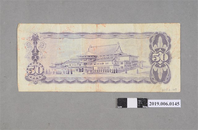 本文物為臺灣銀行發行伍拾圓紙鈔(民國59年版)。民國38年6月15日臺灣省政府實行幣制改革,公布「新臺幣發行辦法」,發行「新臺幣」(改制前為舊臺幣),舊臺幣肆萬圓兌換新臺幣壹圓,民國38~49年發行之新臺幣版面為直式,民國50年為橫式,民國50年5月1日開始印製新版橫式紙鈔。此為民國59年伍拾圓版本,由中央印製廠印製,紙鈔版面顏色為紫色,正面為孫中山國父像,背面圖案為陽明山中山樓。