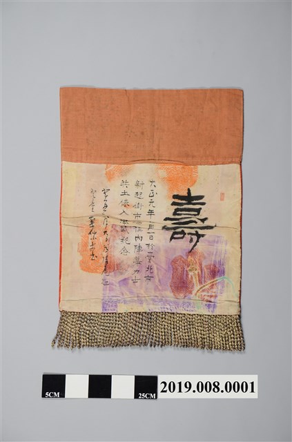 根據綾尾慎治所述,其祖父母綾尾鎚太郎、つぎ,大約於120年前(1899年)是作為宗教家而來臺灣,定居臺北。其長子勉於明治43年(1910年)出生(灣生),日本相撲界為了宣傳相撲活動,派遣很多力士(相撲選手)巡迴至各地進行相撲比賽,除此之外,也有進行相關的儀式(日文稱為行事)活動,有一種為橫綱為首的人氣力士抱著嬰孩,祈求孩子健康的活動。大正元年(1912年)時,其三歲時也參加此類活動,參加時作為紀念的就是給予嬰孩一個小的有裝飾的織品,稱為化妝まわし(裝飾兜襠布),此件是孩子用的兜襠布。活動就是為了跟力士一起參加相撲上場儀式(日文為土俵入り),製作一個符合身形的小的織物,上面鏽上含有本人的名字(勉),字是刺上勉山兩字,並加以彩色裝飾。當時據說不僅捐贈者父親綾尾勉,也包含很多其他臺灣的小朋友也參加這個活動。因為偶然家族也保留這物件,作為臺日交流見證。