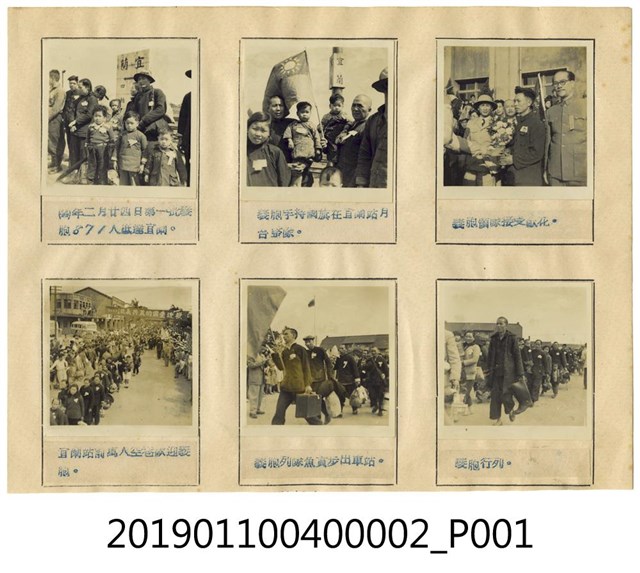 本文物為大陳島軍民撤退照片組之2,內容分別為「(44)年二月二十四日第一批義胞871人抵達宜蘭」、「義胞手持國旗在宜蘭站月台整隊」、「義胞領隊接受獻花」、「宜蘭站前萬人空巷迎接義胞」、「義胞列隊魚貫步出車站」、「義胞行列」等,共有六張照片。