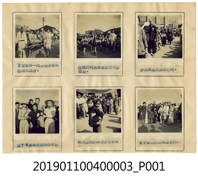 本文物為大陳島軍民撤退照片組之3,內容分別為「宜童軍第一團擔架隊位病弱義民服務」、「義胞行例由羅東國校樂隊領先」、「步出車站之義胞行列」、「童子軍扶助老義胞出車站」、「戰火孤兒亦○澤自由來縣」、「童子軍協助義胞徹運行李」等,共有六張照片。