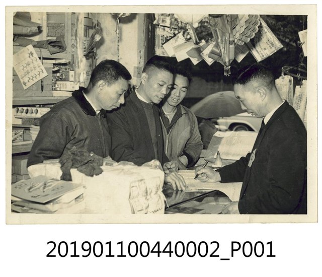本文物為戰後戶口普查照片之2,右邊為政府戶口普查人員,左邊三位則是協助戶口普查的民眾,可以看到其拿出身分證協助登記的行為。