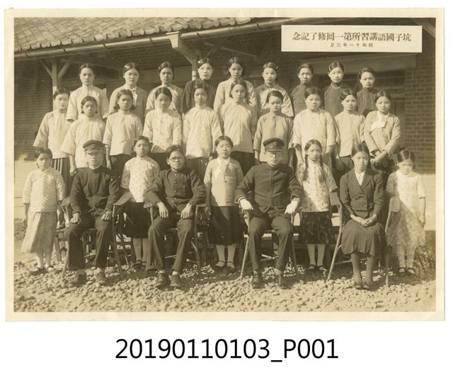 此文物為國語講習所結業紀念攝影照片,為黑白照片,照片上半部有一行字「坑子國語講習所第一回修了記念 昭和十一年三月」,照片已有些微褪色。