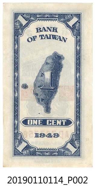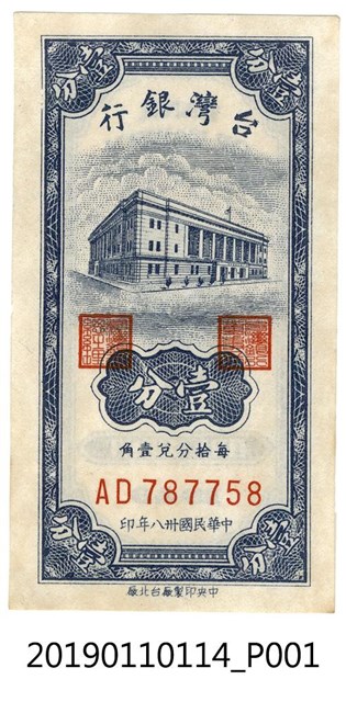 此文物為臺幣壹分,民國38年(1949)版本的樣式,幣紙底色為白色,花紋顏色為深藍色,四個角都有印一個「壹分」,最上方印有「臺灣銀行」的字樣,中間圖案為臺銀總行及壹分的圖案,兩旁有印兩個印章,圖案下方印有鈔票編號及「中華民國三十八年印」的字樣。