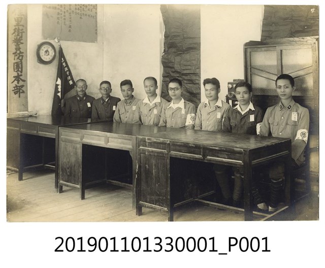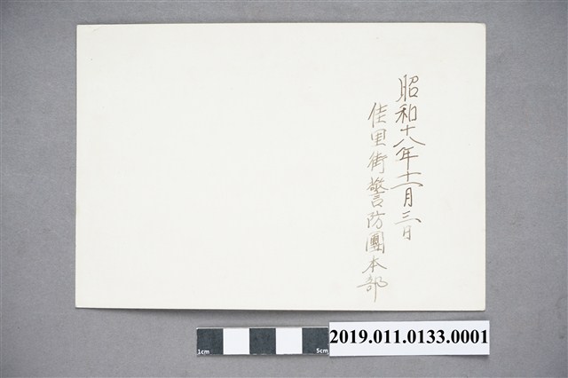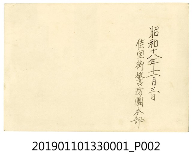本文物為昭和18年(1943)11月3日,佳里街警防團於其團本部合影之黑白照片,一共8人,其左胸口皆貼有一名牌,左手臂則掛有防空團之臂章。照片左側則有一「佳里街警防團本部」木牌及佳里街警防團的旗幟。照片背面則有寫有照片拍攝時間及地點。臺灣的警防團於昭和18年(1943)敕令194號〈臺灣警防團令〉,將原有的防衛團、消防組、壯丁團整併為警防團,並由內務轉制警務系統管轄,其正副團長多由在臺日人或臺籍地方人士所領導,其任務為防空、消防、救護等工作。