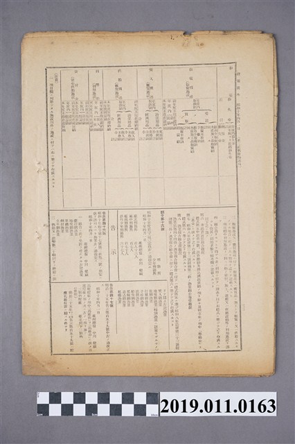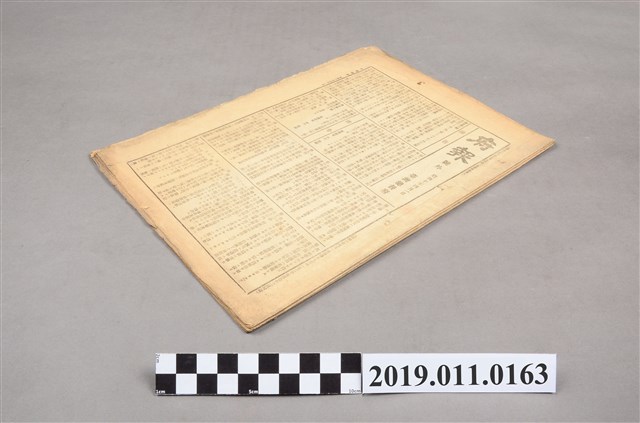 本文物為昭和10年(1935)4月1日的臺灣總督府府報號外,臺灣日日新報12572號附錄,以日文書寫,內容為諭告第一號及律令第一號。