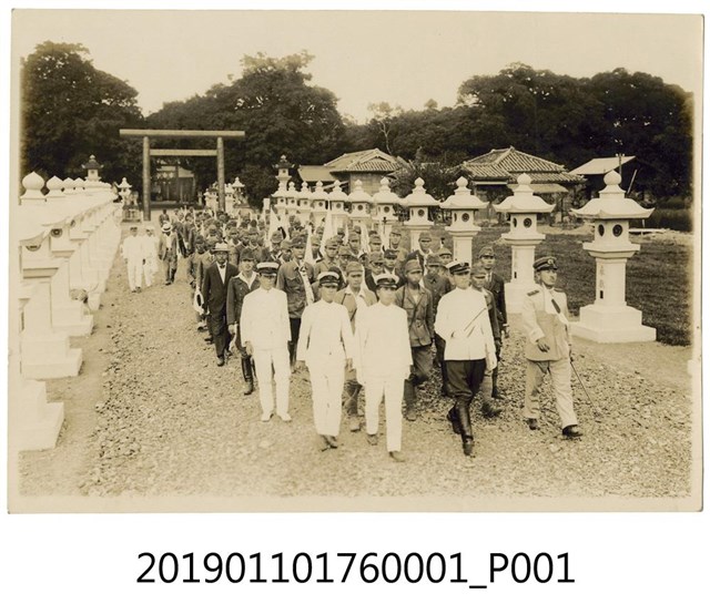本文物年代為日治時期相片,其保存狀況良好。文物中可見數十名著日本軍服的男士,最前排的人穿著較為高級,隊伍中有多人皆有拿日本國旗。後方鳥居的柱子上有模糊字跡,走道兩旁的石燈籠刻有「奉獻」二字。