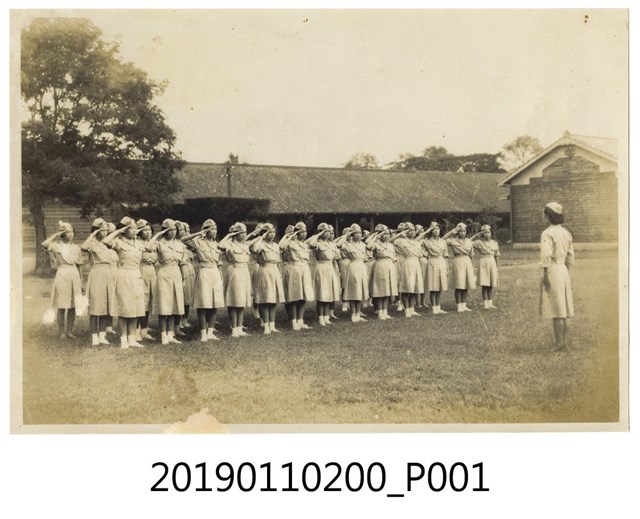 本文物的年代為戰後時期,為一黑白相片,其下方有一處磨損。相片中可見數名著制服的女學生,並戴著別有徽章的帽子,正面向老師敬禮,而學生後方為木造校舍。相片中的女學生,制服長度皆超過膝蓋,頭髮與耳垂一樣高。其中最左邊的學生沒有穿鞋