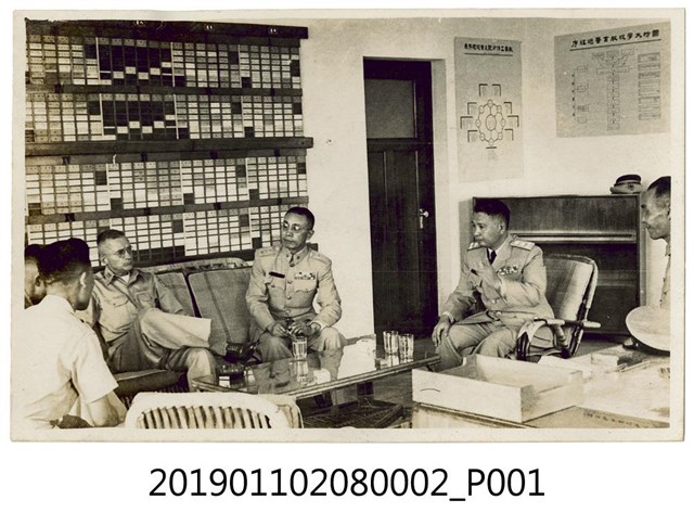 本文物為戰後初期的相片,為黑白相片,保存狀況良好。相片中共有六位人物坐在辦公室中,皆穿著軍服,其中一名美國人翹著腿,一名臺灣人左手正舉起。右後方牆上掛有兩幅圖,其中一幅印有「國防大學校教育……」等字,皆為圖表類型。左方牆上則可見黑白不一的方格。
