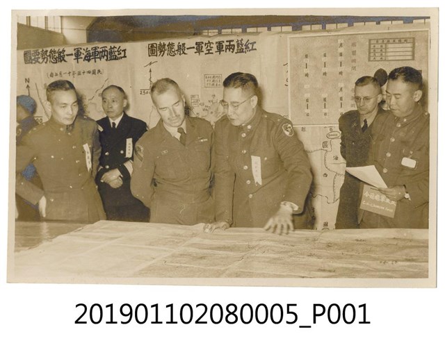 本文物為戰後初期的相片,為黑白相片,保存狀況良好,照片左方人物顏色有變異。相片中有七人,皆穿著軍服,其中有兩名美國人。相片中央的兩個人看著地圖在討論,後方立有三塊告示板,由右至左依序印有「演習時間 作戰時間」、「紅藍兩軍空軍一般態勢圖」及「紅藍兩軍海軍一般態勢圖」,最後一張海報印有「民國四十三年十一月上旬」。