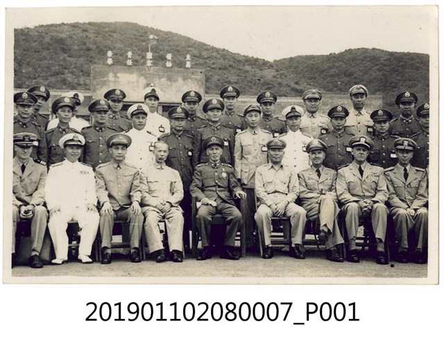 本文物為戰後初期的相片,為黑白相片,保存狀況良好。照片中有三十位人物,第一排為坐姿,後方皆為站姿,其中第一排有四名美國人。最中央者為已故總統蔣中正先生,照片中有數名穿著白色軍服者。人群後方可見兩座山丘及一棟建物,建物上方立有「榮譽」、「責任」、「國家」、「領袖」、「親愛精誠」等字,其屋頂插有國旗。