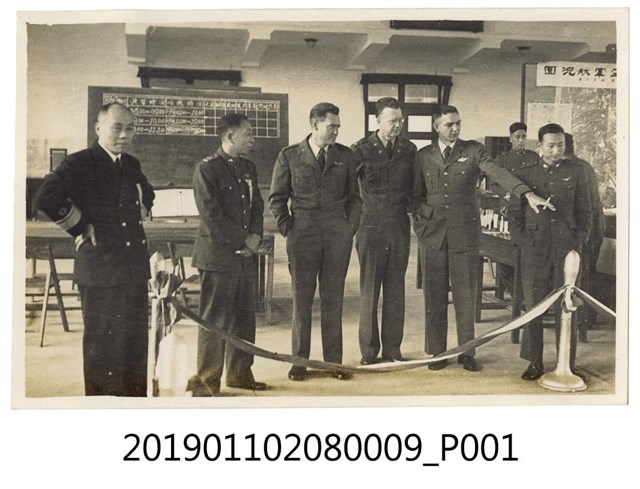 本文物為戰後初期的相片,為黑白相片,保存狀況良好。照片中的人物皆穿著軍裝,中央為三名美國人,其中一名手上著香菸。人物前方有布條將東西圍住,左後方牆上有一面黑板,上面記載「演習時間」、「作戰時間」、「天氣」、「風向」等資訊,右後方則掛有印著「……狀況圖」的紙張。