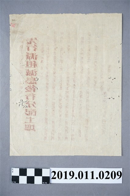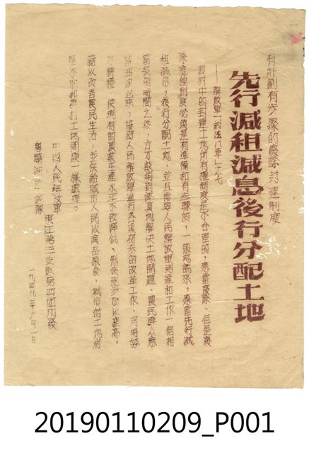 本文物為1949年由中國人民解放軍印製發行,文物有多處破損。文物印有「有計劃有步驟的廢除封建制度」、「先行減租減息後行分配土地」、「解放軍『約法八章』之七」。文章中提及現行封建土地所有權制度為不合理的,需透過減租減息的方式改善,且需要人民解放軍的協助達成。文末印有「中國人民解放軍 粵贛湘……第四團印發」及「一九四九年六月一日」。