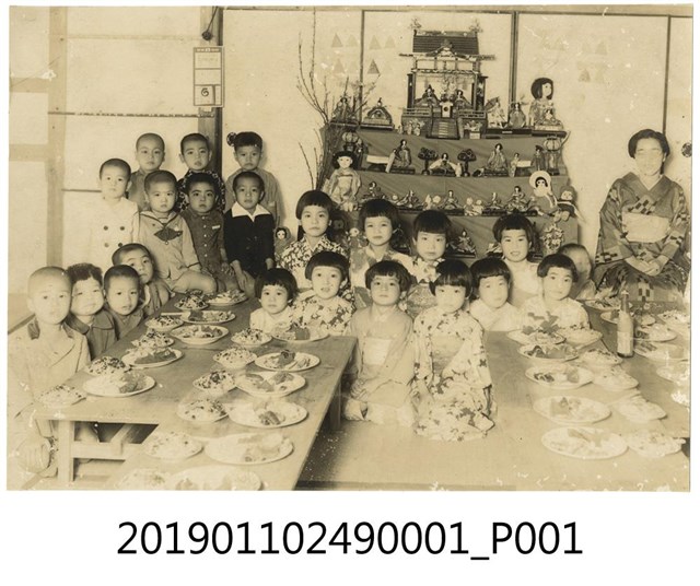 本文物為日治時期的黑白相片,其保存狀況良好。文物中可見男女小朋友各11名及女老師1名,其中女孩都穿著和服。女孩後方擺有四層玩偶,為女兒節活動的擺飾,其中不僅有穿著日本服飾的玩偶,亦有洋娃娃。男孩後方柱子上掛著印有日本國旗的日曆。