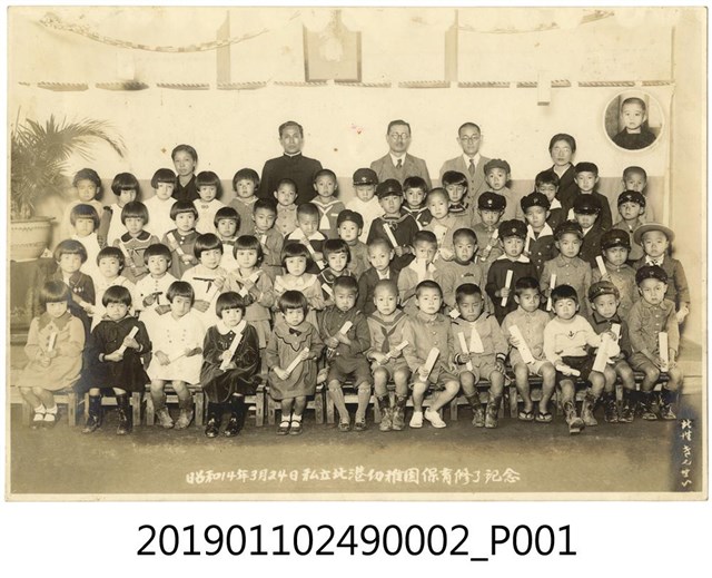 本文物為日治時期的黑白相片,文物狀況良好。相片中可見四排學生及五名師長,其中相片右上方的圓框裡有一名男孩照。相片底部有白字「昭和14年3月24日 私立北港幼稚園保育休了紀念」。