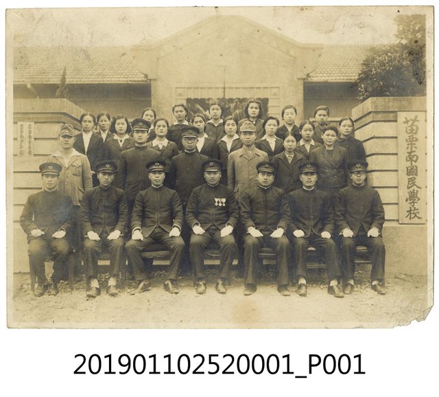 本文物年代為日治時期,為一黑白相片,文物有些微破損。相片可見17名女性及11名男性於校舍前合影,而前排的男性為坐姿,中間的人胸前別有三枚勳章。校舍門口有「苗栗南國民學校」的木牌