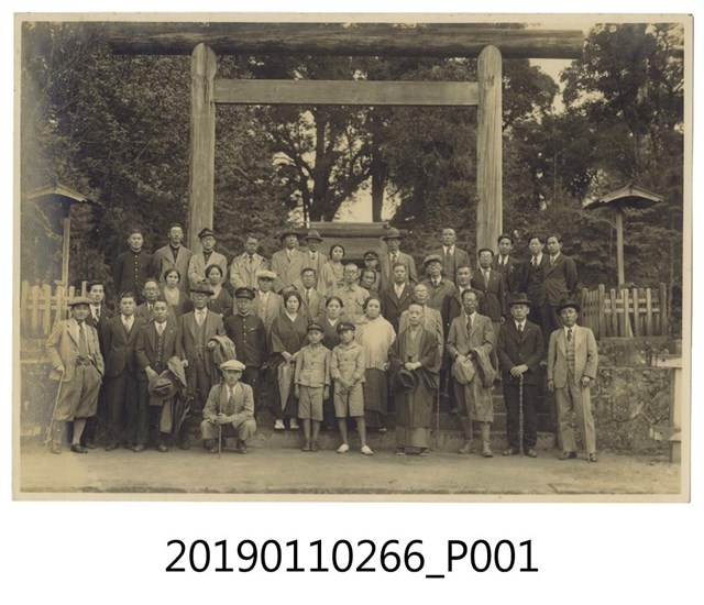 本文物年代為日治時期,為一黑白相片,文物保存狀況良好。文物中有41個人站在鳥居前合影,相片中的人物有穿著西式服裝及日式和服者。人群中最前排有幾名男士手拿著拐杖,亦有人蹲著。