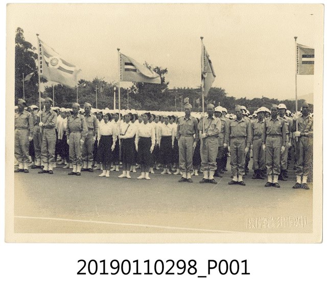 此照片為總統校閱民防隊員照片,隊員皆為立正姿勢,年代、成員與地點無法確認,但右下角有一中國電影製片廠的鋼印,或許與其有關。