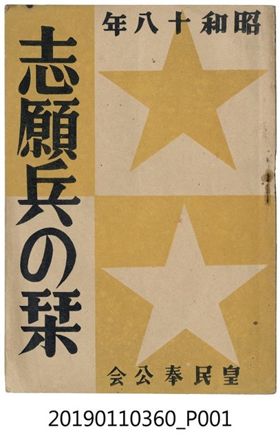 此為昭和18年(1943)志願兵介紹手冊,由皇民奉公會刊印發行,未見內頁無法確定其內容,封面由黃白相間星星組成,應為因應皇民化運動而產生。