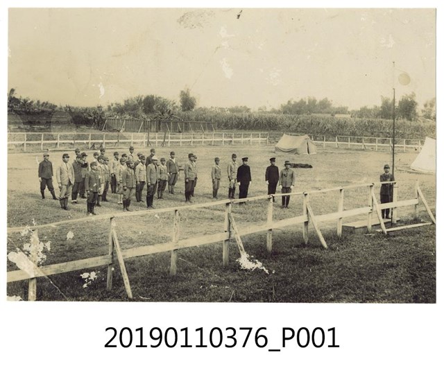 本文物為皇民奉公會成員於鍊成所學員舉行升旗儀式照片,在照片中皇民奉公會成員在柵欄所圍起來的草地上舉行升旗儀式。