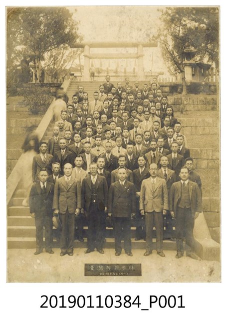 本文物為昭和15年(1940)2月1日臺灣神社參拜照片,在照片中士紳團體站在鳥居前面下方的參道拍照,另外有一些民眾從旁經過。