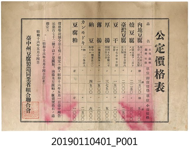 本文物為昭和16年(1941)豆腐類公定價格表,由臺中州豆腐製造同業組合聯合會在1941年5月14日所發布,內容包含各種不同項目豆腐的規格、單位、公定價格。