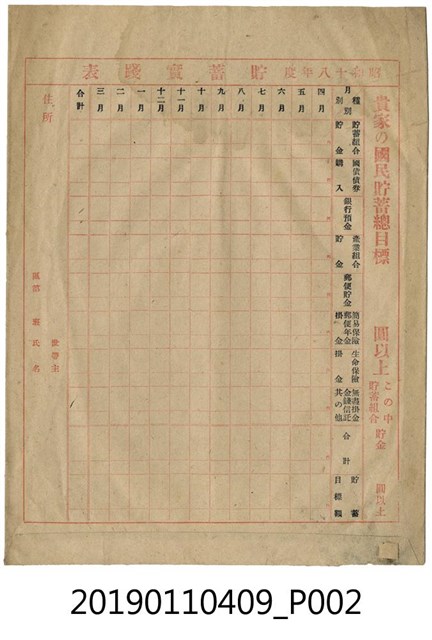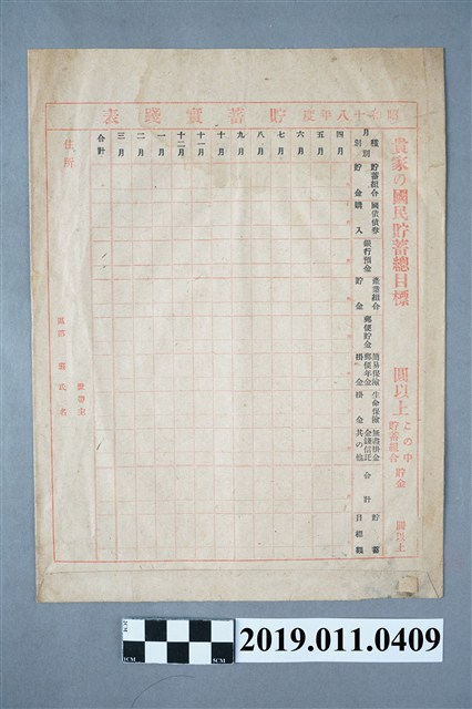 本文物為貯蓄奉公袋,由臺灣總督府、皇民奉公會、 臺灣金融協議會共同發放,旨在推動國民儲蓄共同為國家奮戰,並說明年度貯蓄目標為270億圓。在貯蓄奉公袋背面則寫有月份、各項貯蓄組合及貯金、簡易保險/郵便年金/掛金、無盡掛金/金錢信託/其他、儲蓄目標額等項目。