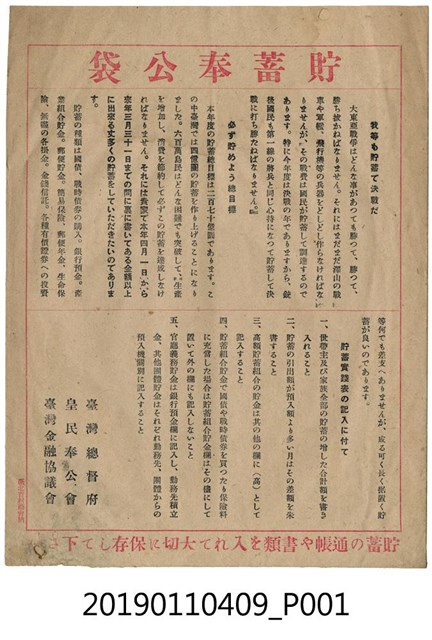 貯蓄奉公袋、臺灣總督府、皇民奉公會、 臺灣金融協議會、國民儲蓄