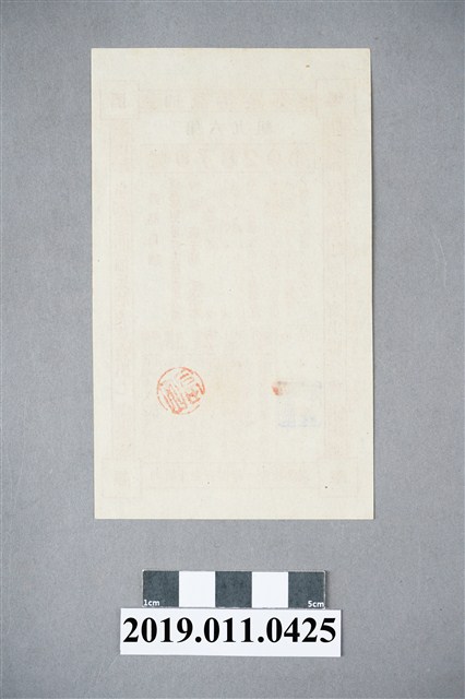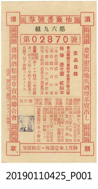 本文物為昭和12年(1937)臺灣酒類菸草賣出聯合會抽獎券,內容說明獎品目錄有特等壹仟圓、一等壹百圓、二等拾圓、三等壹圓、四等五拾錢,以及發行期間、抽籤月日、中籤發表、兌換時間及場所。