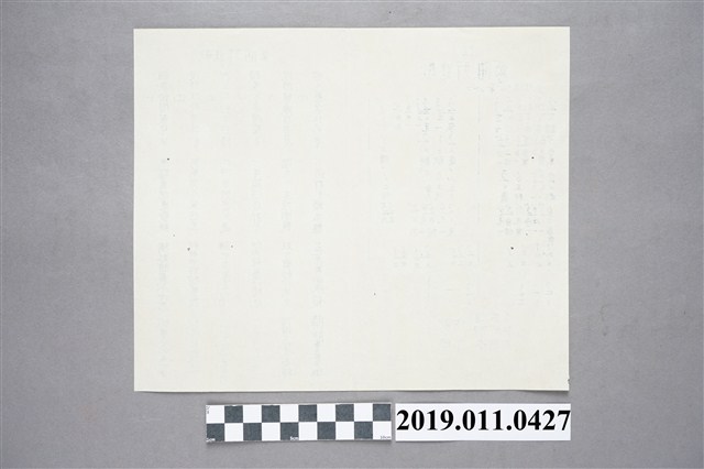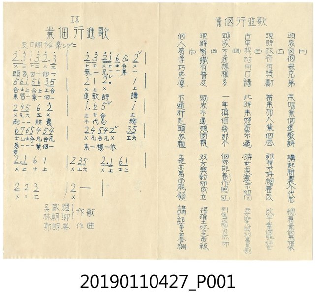 本文物為佃農行進歌曲譜,吳勝輝、林朝卿作歌、郭明峯作曲,內容講述地主與佃農的關係,提倡「業佃組合」的重要性。