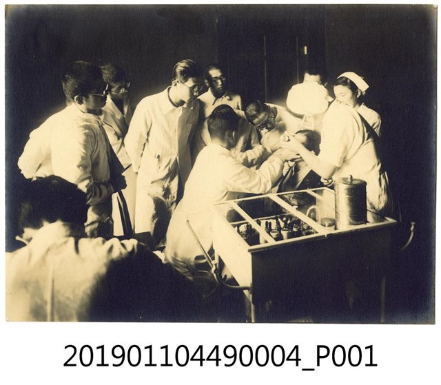 本文物為臺北帝國大學醫學部(現今臺灣大學醫學院)學生實習之情形照片。1928年時臺北帝國大學成立之初並未設醫學部,1936年臺北醫學專門學校併入臺北帝國大學後,才正式創設醫學部。