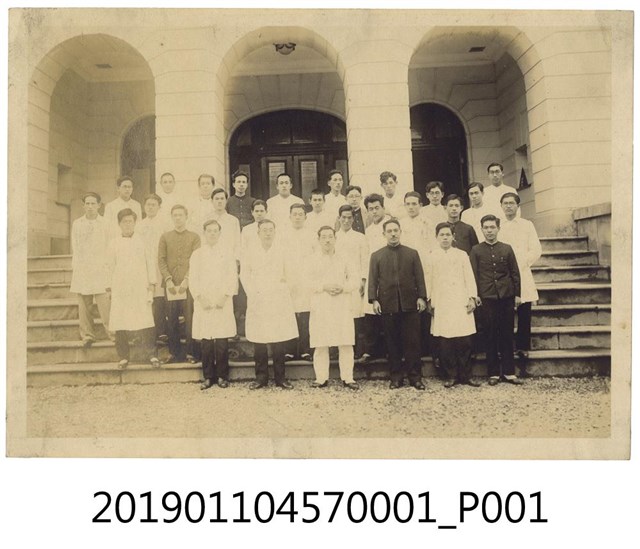 本文物為臺北帝國大學醫學部教授合影照片。1928年時臺北帝國大學成立之初並未設醫學部,1936年臺北醫學專門學校併入臺北帝國大學後,才正式創設醫學部。