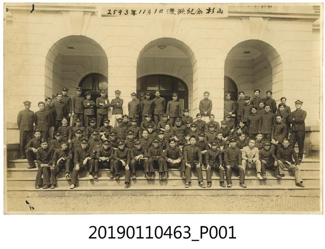 本文物為日治時期的黑白相片,其保存狀況良好。相片中可見75名男性於校舍前合影,其中坐於中央椅子上的人較為年長。相片上方有白底黑字,寫著「2593年11月1日 渡歐紀念 杉山」等字。「2593」為日本的一種紀元體,其以日本神話中的第一代天皇—神武天皇的即位元年開始起算。