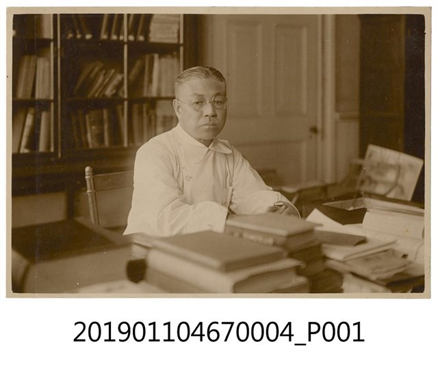 本文物為日治時期的黑白相片,其保存狀況良好。相片中的男子為堀內次雄先生,其穿著白袍坐在辦公室內,桌上及後方櫃子放滿書籍。堀內次雄生於1873年,曾任職軍醫,後於1915年接任臺灣總督府醫學院第三任校長,有學者稱其為「臺灣醫學之父」。
