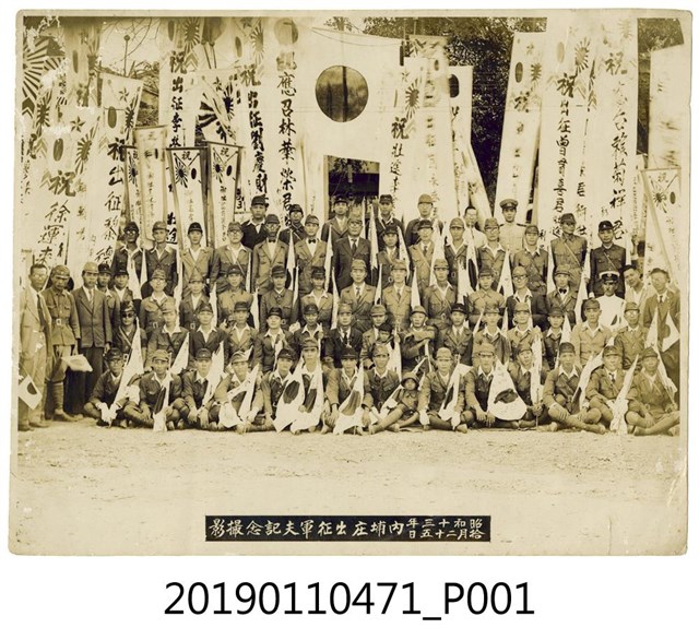 本文物為日治時期的黑白相片,其保存狀況良好。相片中可見數十名男性穿著軍服一起合影,人群中央有一面日本國旗。相片中的人物皆有拿日本國旗,且國旗上都寫滿祝賀徵召入伍的話,如「祝出征曾貫喜君壯途……」、「祝應召賴菊祥君」等。相片下方有黑底白字「昭和十三年拾月二十五日」、「內埔庄出征軍夫記念撮影」