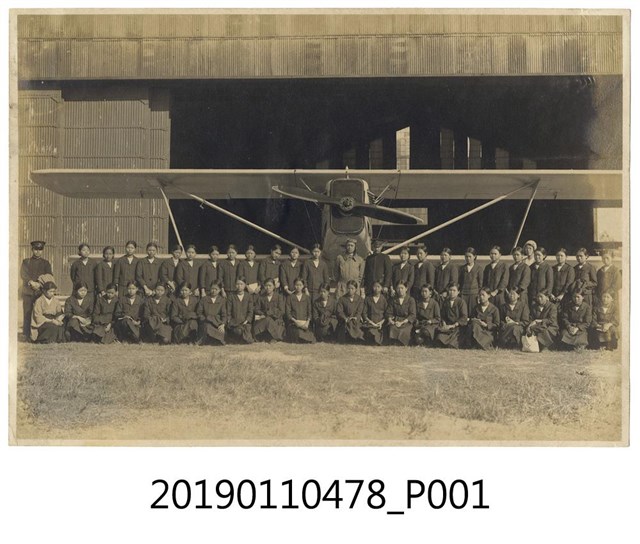 本文物為日治時期的黑白相片,其保存狀況良好。相片中有48人於飛機前合影,人群中央有一名穿著空軍服裝者,相片中部分女學生手上拿著紙本。