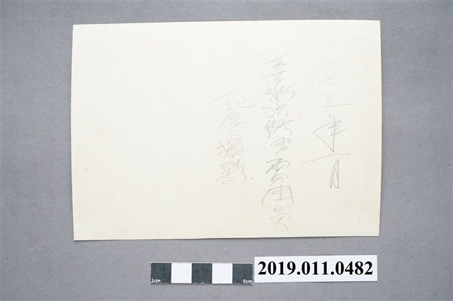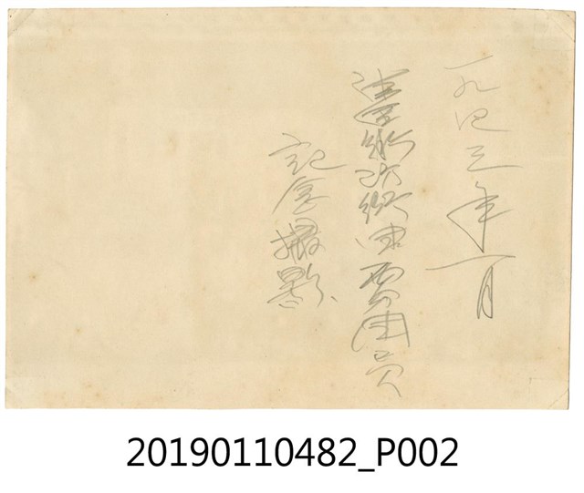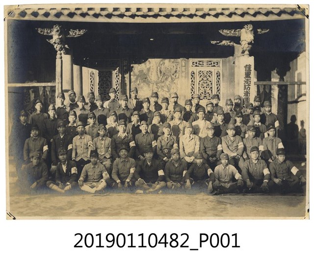 本文物為日治時期的黑白相片,其保存狀況良好,相片四個角落有黑色汙漬。相片中可見數十名男性於一廟宇前合影,其皆穿著統一服飾,左臂別有布條,上面寫著「防」字。人群右後方布條寫有「佳里街防衛團」,相片背面以鉛筆寫有「一九四三年一月……团員記念撮影」。